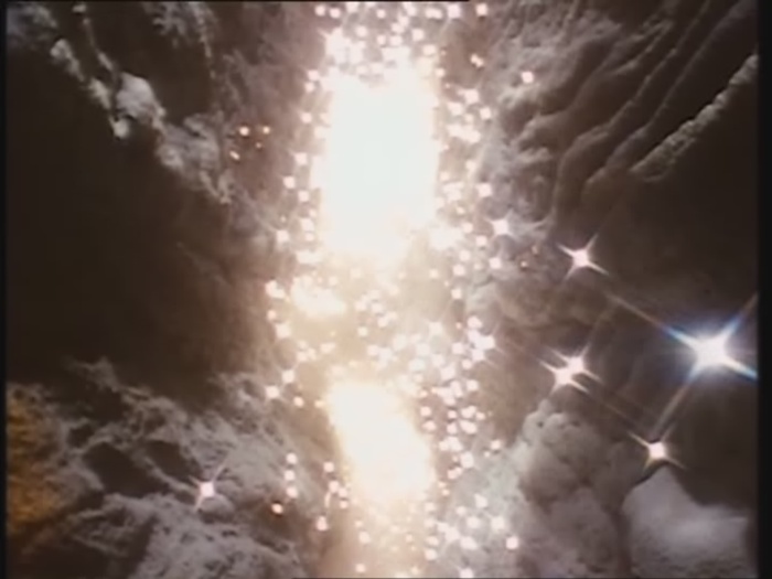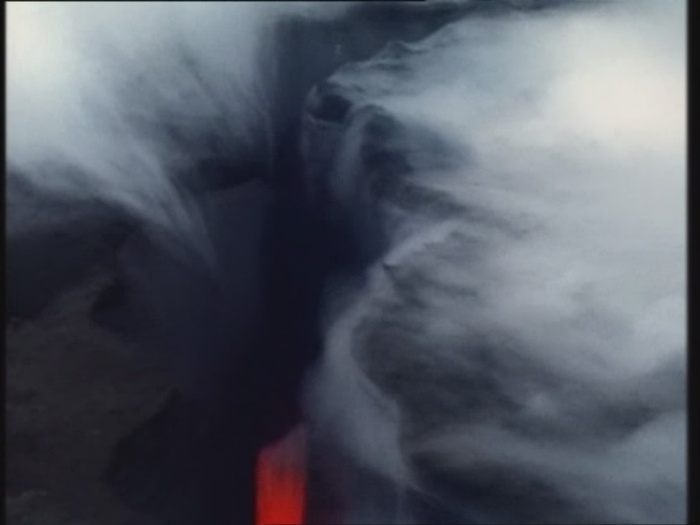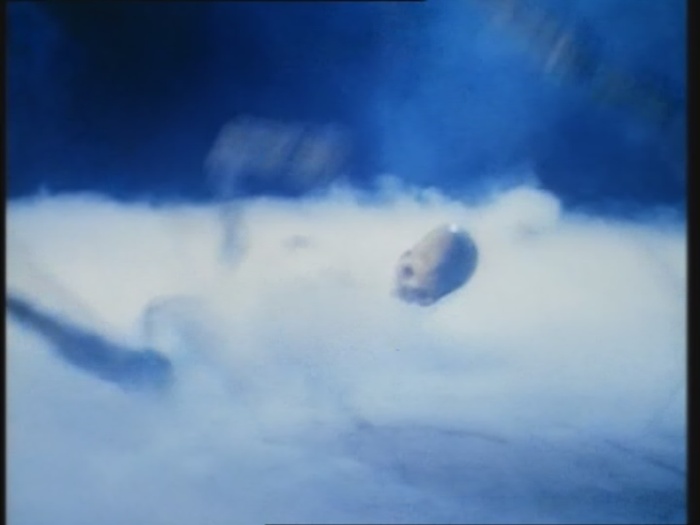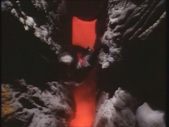 Am Krater angekommen wirft sie den Kopf des Knochenmanns hinein.