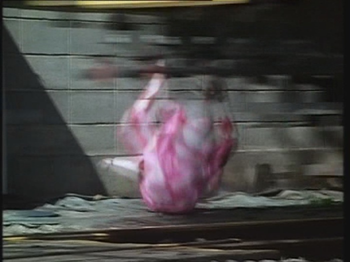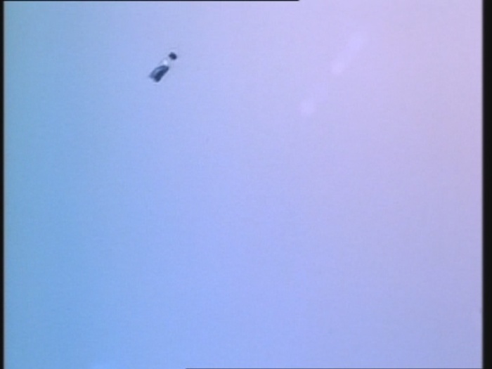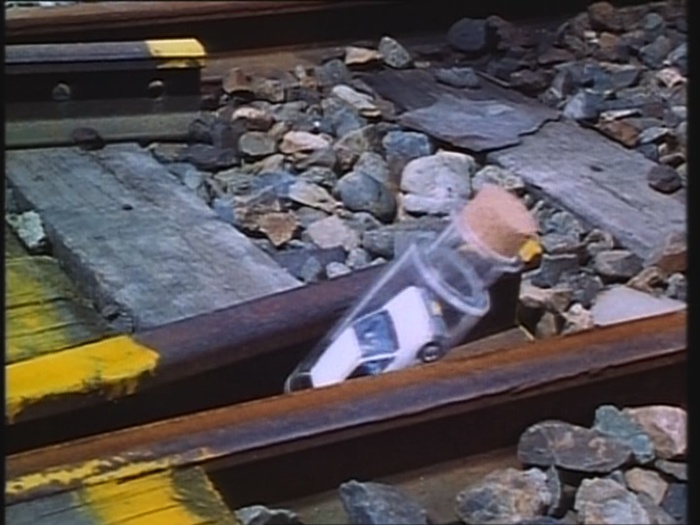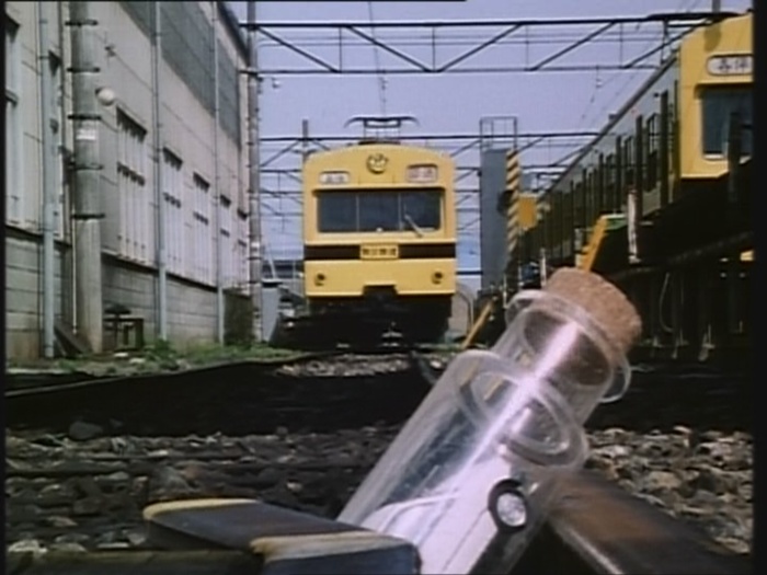 Wieder fliegt die Flasche durch die Luft. Sie landet sicher auf ein paar Gleisen.
