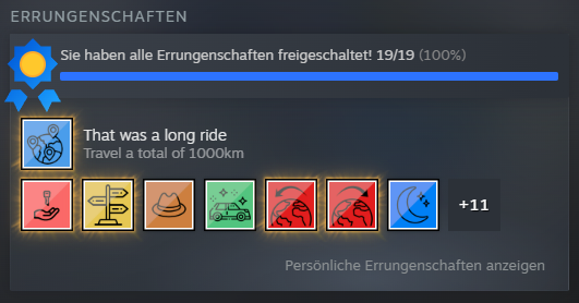 Ich bin nicht die richtige Person, um über Spielinhalte zu sprechen. Ich habe keine Ahnung, wie viele Strecken und Fahrzeuge es gibt. Klar, könnte ich nachzählen, aber das hier ist einfach nicht der Ort für solche Dinge. Das Spiel ist außerdem noch nicht fertig und bisher nur im »Early Access« erhältlich. Vermutlich kommen da noch Autos und Strecken dazu und vielleicht sind dann alle glücklich oder auch nicht. Keine Ahnung. Ich habe jedenfalls alle Errungenschaften geholt, die es zu diesem Zeitpunkt zu holen gibt, und hatte dabei sehr, sehr viel Spaß.