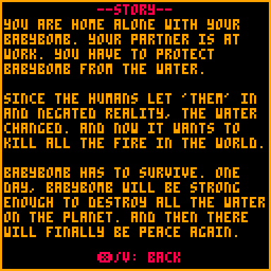 Es handelt sich erneut um ein kleines Arcade-Spiel. Diesmal spielt ihr eine Bombe, die ihr Baby vor aggressivem Wasser beschützen muss.